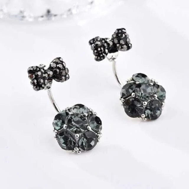 Delicate Bow Stud: The upper portion features a petite, intricately designed bow adorned with shimmering black crystals, adding a touch of dainty refinement.
