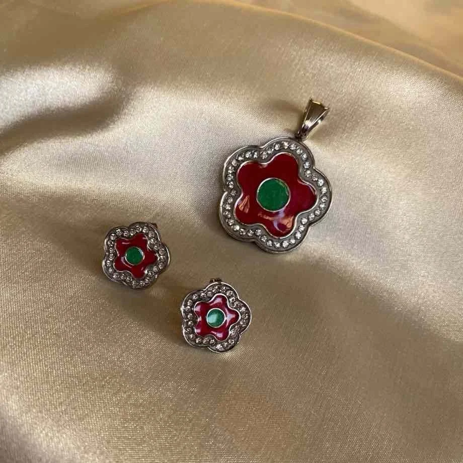 The set also includes matching studs that mirror the floral design of the locket, with the same red and green color scheme at their center.