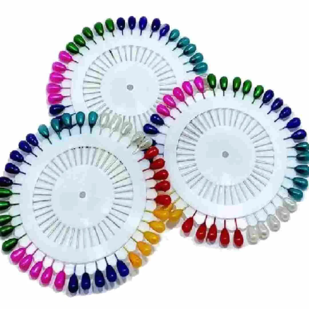 Hijab pins, each adorned with a glossy, teardrop-shaped head and metallic pin. The pins are elegantly arrayed in a vibrant color spectrum, featuring rich reds, sunny yellows, lush greens, serene blues, royal purples, bright pinks, and classic whites. Neatly embedded in a sleek white circular pad, these pins offer both beauty and practicality, making them an essential accessory for any hijab-wearer.