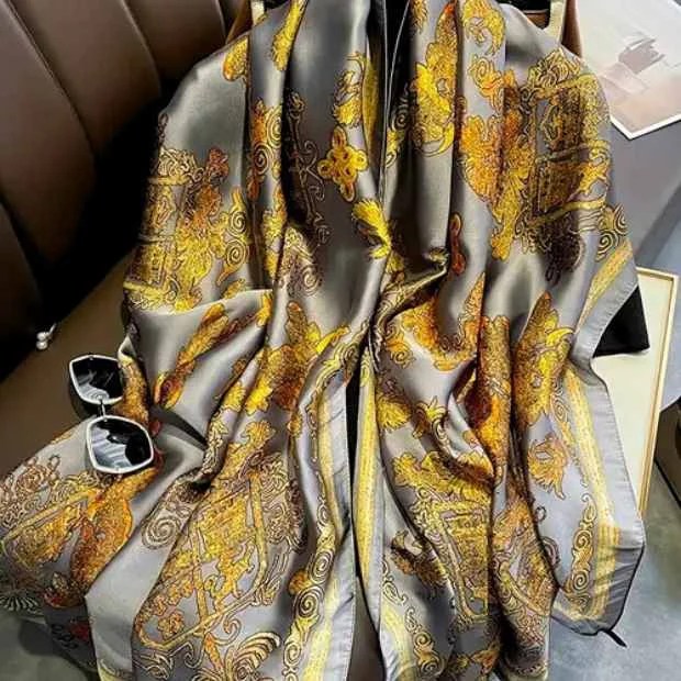 Expertly crafted from the finest silk, this exquisite scarf offers an unparalleled softness and a delicate sheen, ensuring both comfort and elegance in every wear.