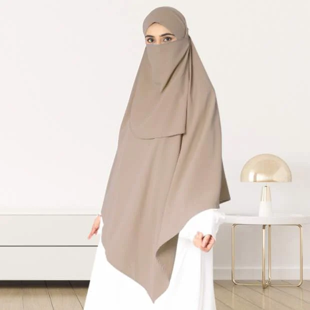 We include a built-in niqab that easily pulls down when needed, along with a separate tie-back niqab for styling flexibility.